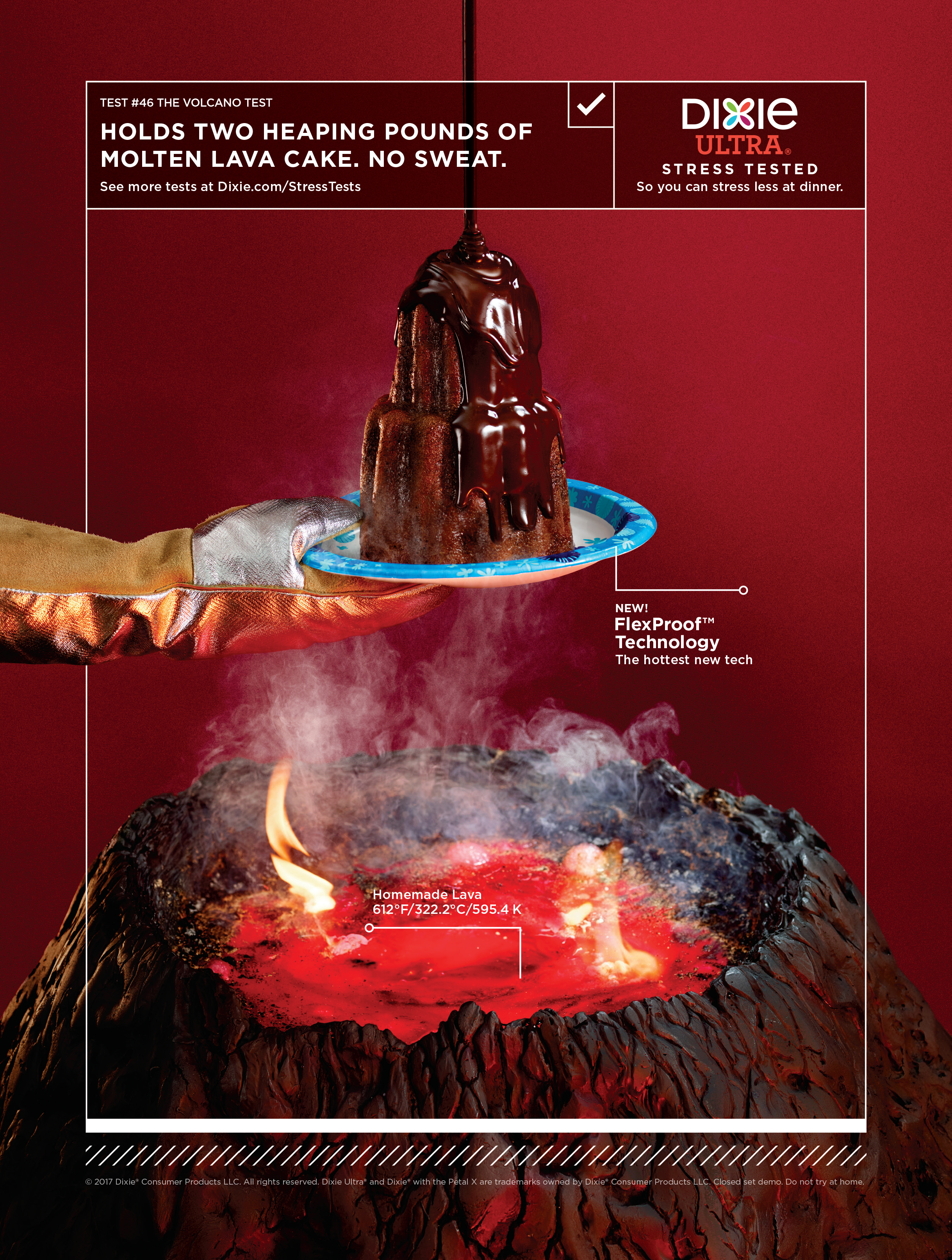 Dixie’s Ultra paper plate is quite simply the strongest paper plate on the market. So we stress tested the crap out of it in the most stressful situations we could think of (all very loosely inspired by real Dixie R&D tests). We showed off this series of stress tests on TV, social, print and banners.