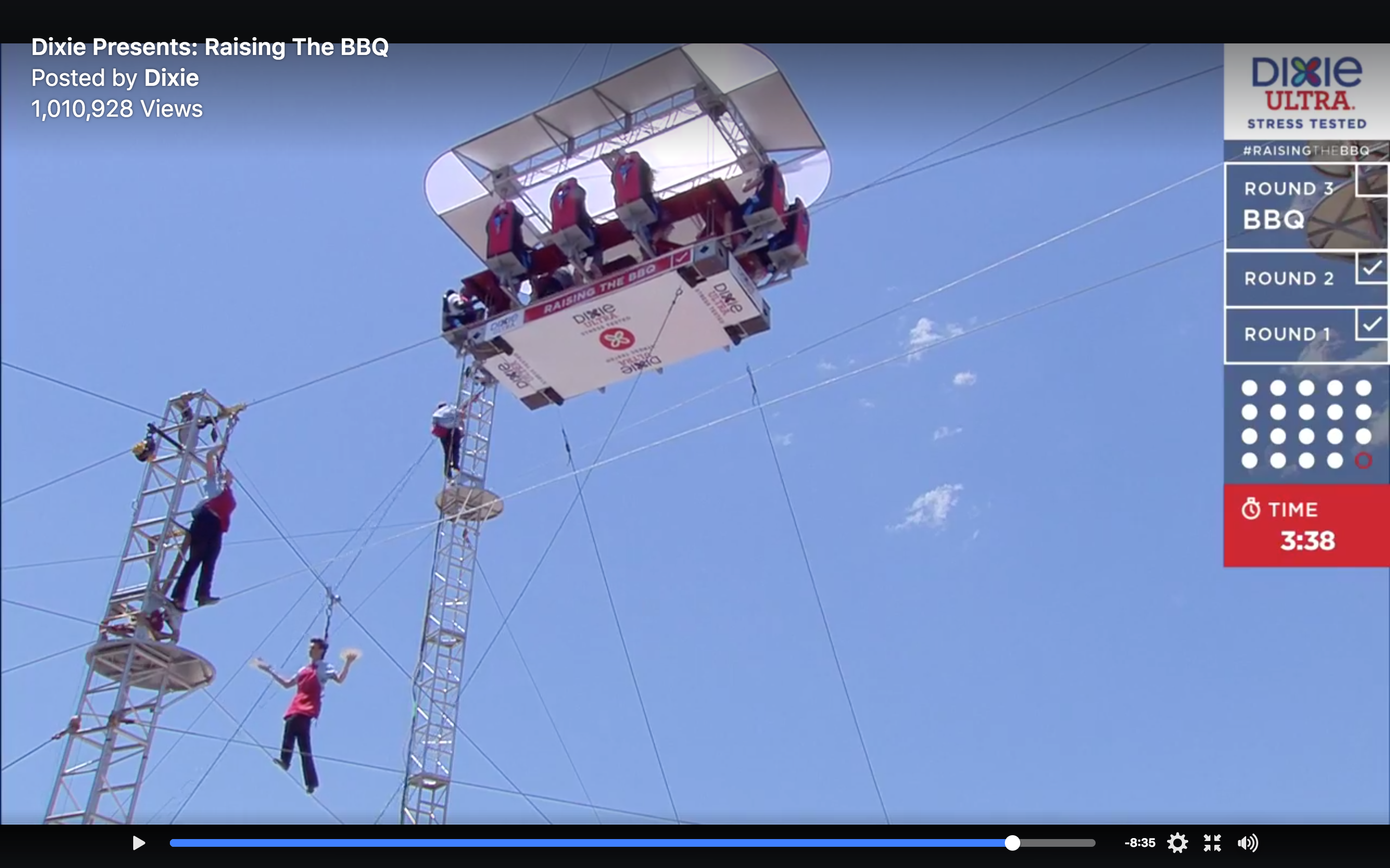 Then we capped the series with a live event called RAISING THE BBQ, where we opened a hanging restaurant 40 feet in the air and hired high wire walking waiters to serve up heavy BBQ on Dixie Ultra plates (they handled the pressure, natch).