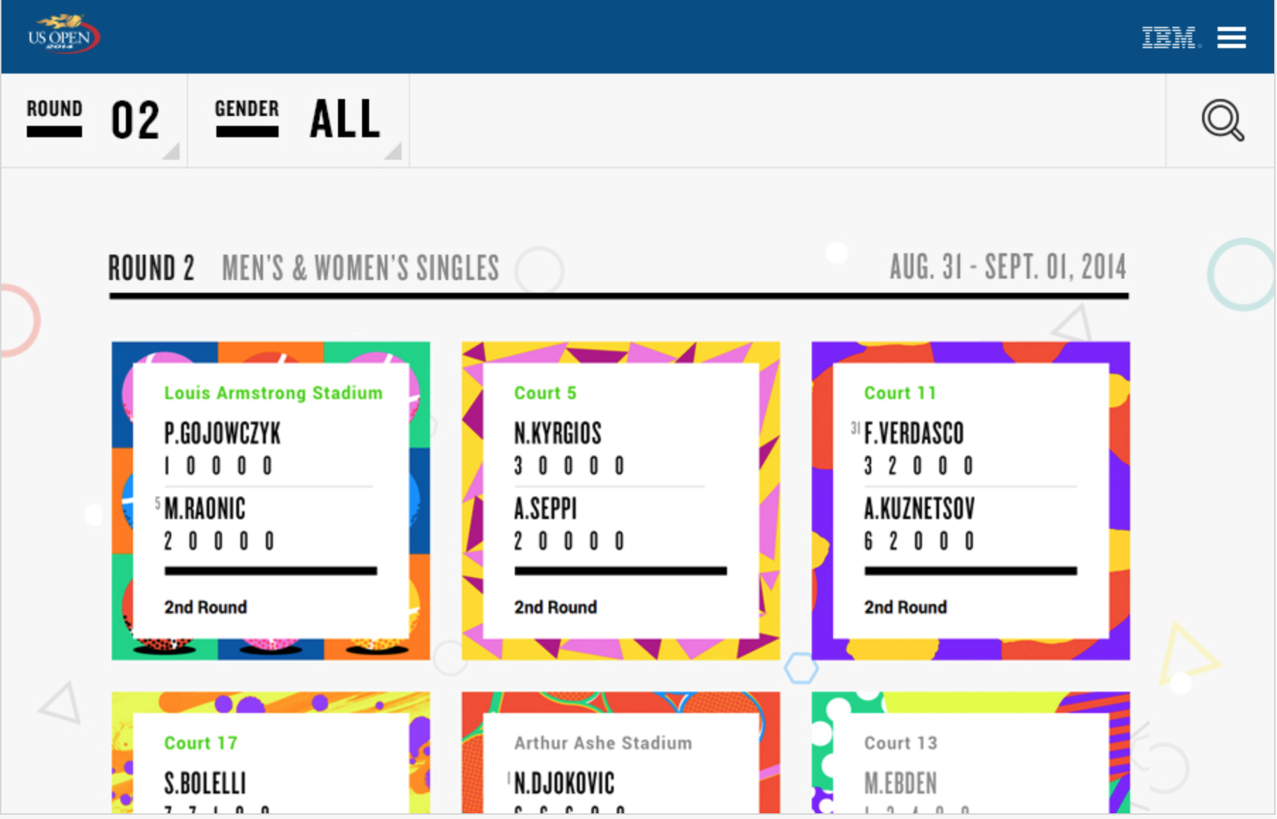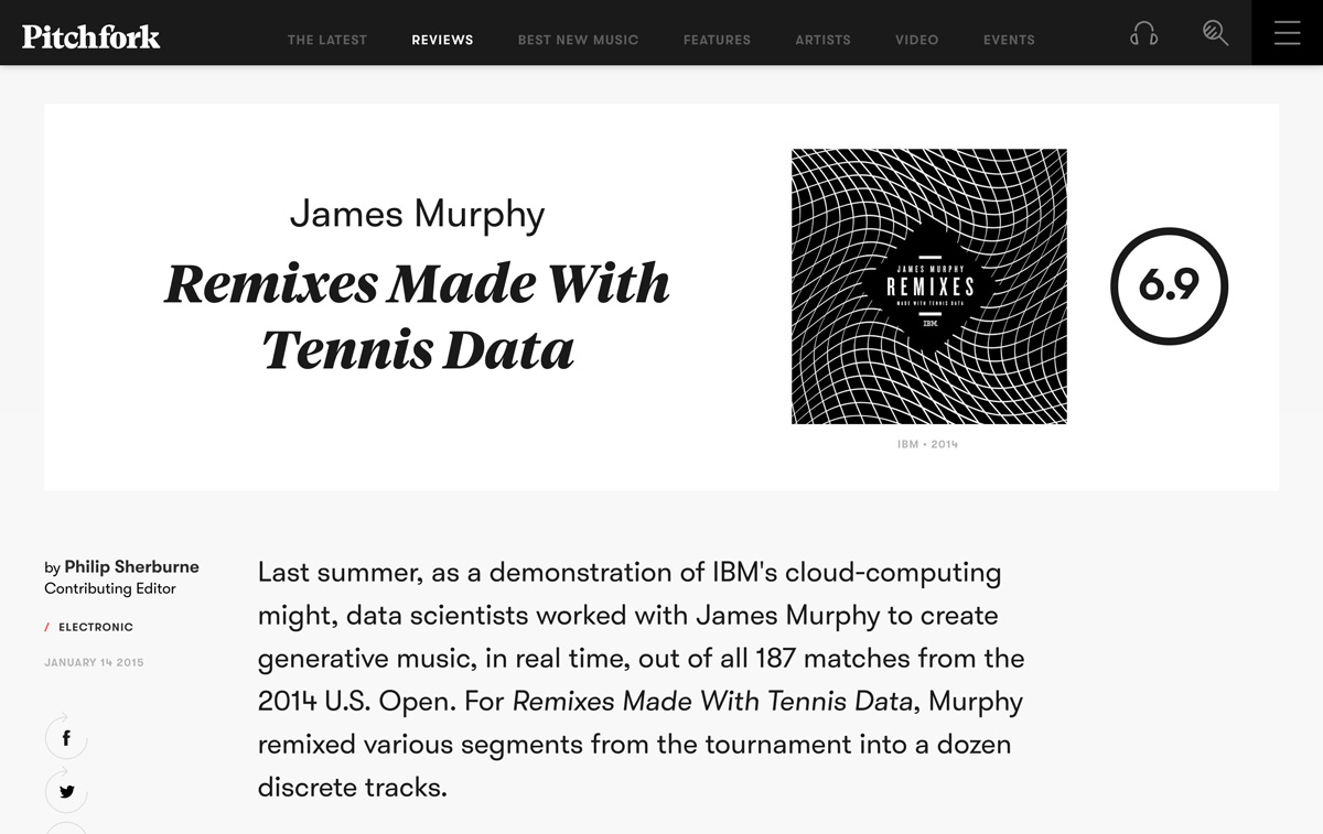 IBM tracks all the data at the US Open, and we partnered with James Murphy (of LCD Soundsystem fame) to turn it into music. We created a custom-built algorithm to turn data points from more than 400 hours of tennis play into music cues, like pitch and tempo, that produced real-time soundtracks for each match. TRANSLATION: 187 different pieces of music wrote themselves in real time, as the matches happened.