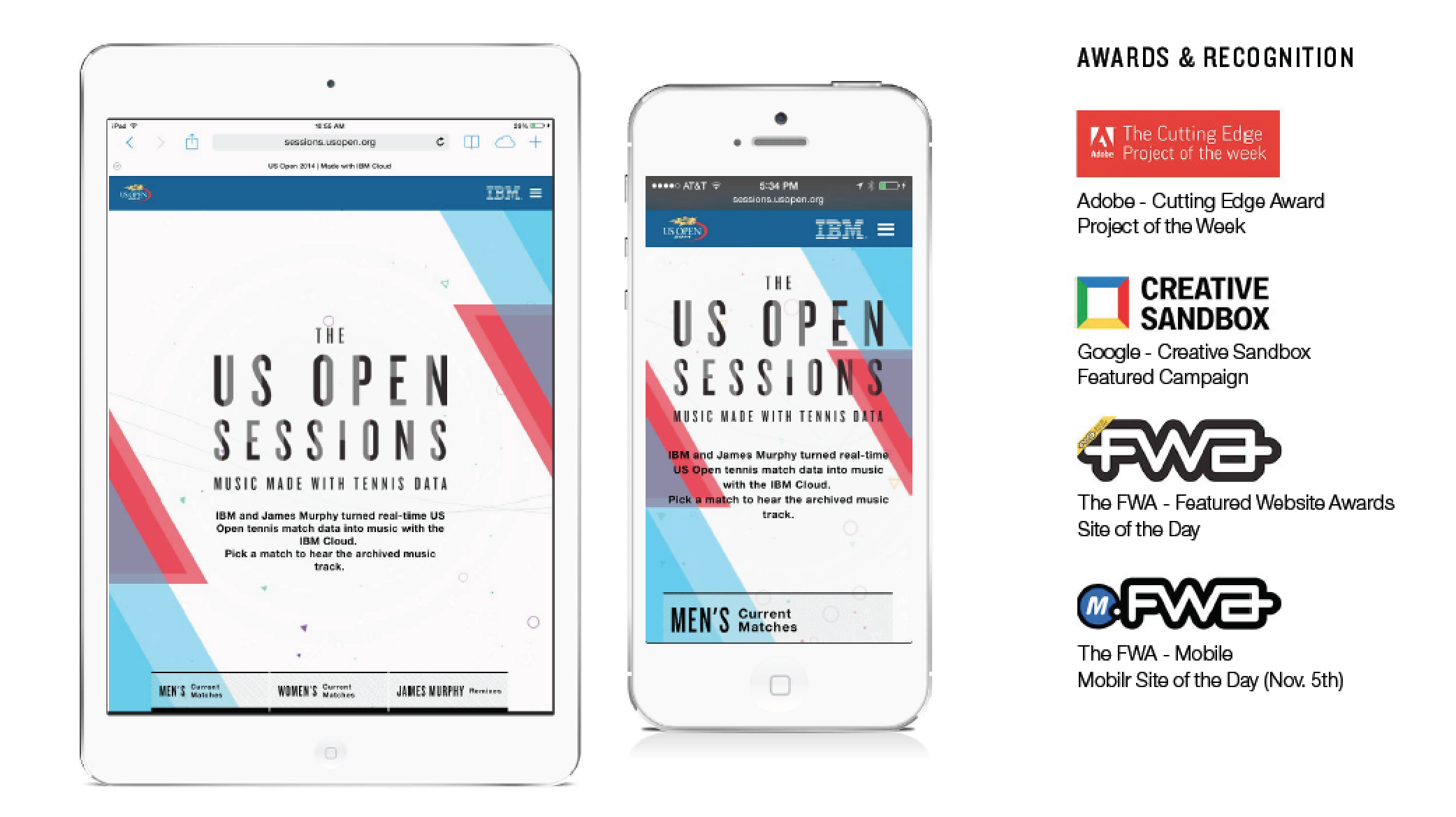 The music was streamed on a mobile first website that was both a music visualizer and a tennis score tracker. So when you heard a change in the music, you saw what happened in the match to cause it. A music lab let you play with the algorithm, and info on the tech used to create the experience was also featured.